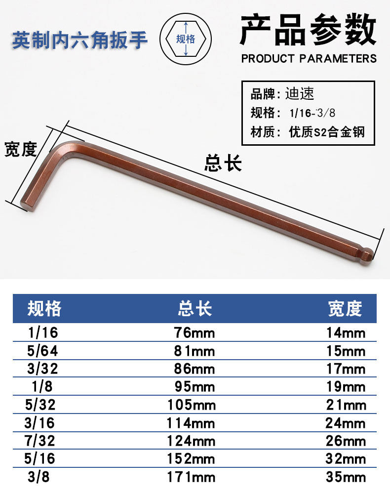 Lengthened hex wrench inch hex wrench single set hardness 16/13 32 7 641 8
