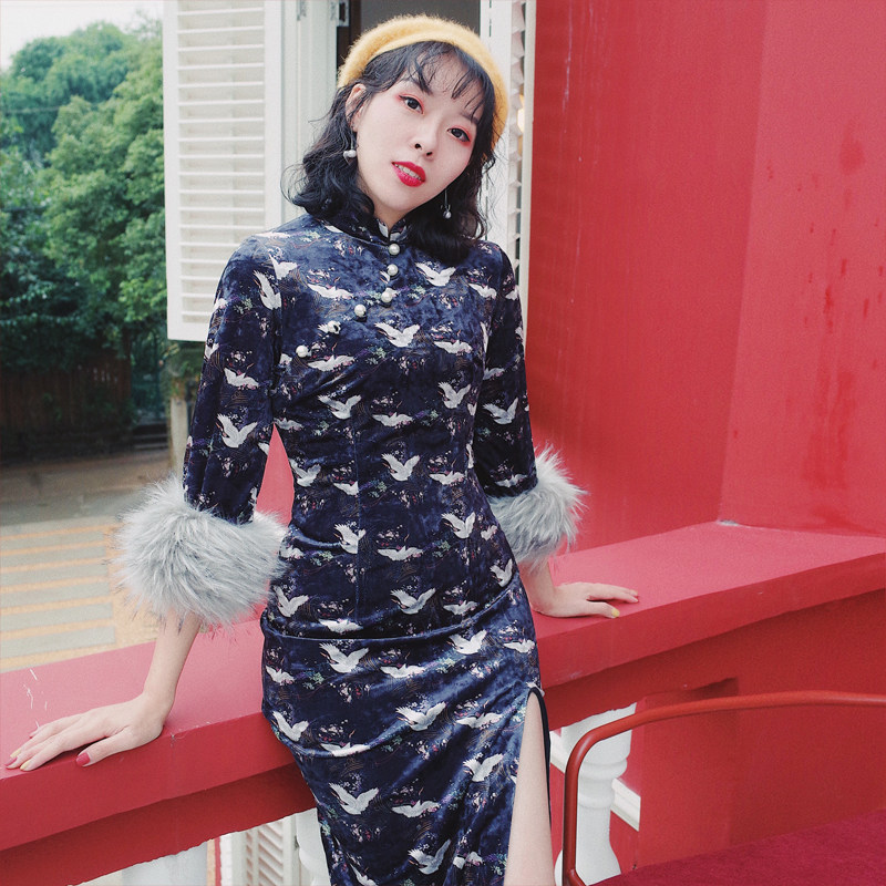 The Yellow Pussy Original Velvet Qipao "Cloud Crane" warlord wife Guofeng Spring and Autumn Improved Long Sleeves Short Qipao