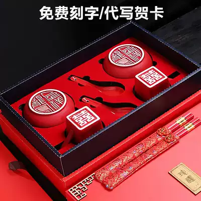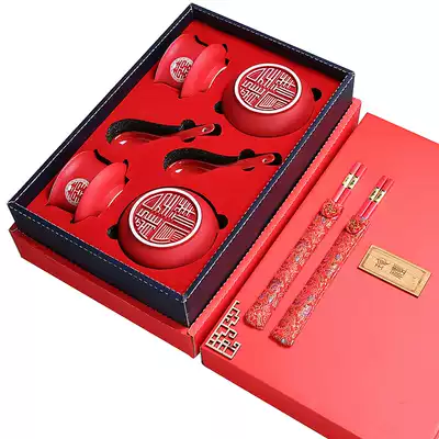 A pair of happy gift boxes, bowls, chopsticks and spoons, a pair of gift boxes, chopsticks and spoons, a pair of pallets, a pair of dragon and phoenix bowls, chopsticks, a pair of mahogany pallets, one each