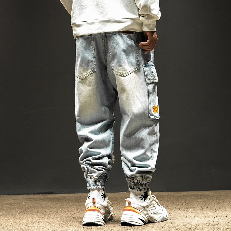 Drawstring feet fashion light blue hole tooling jeans men's fashion brand loose trousers 2021 new summer trend