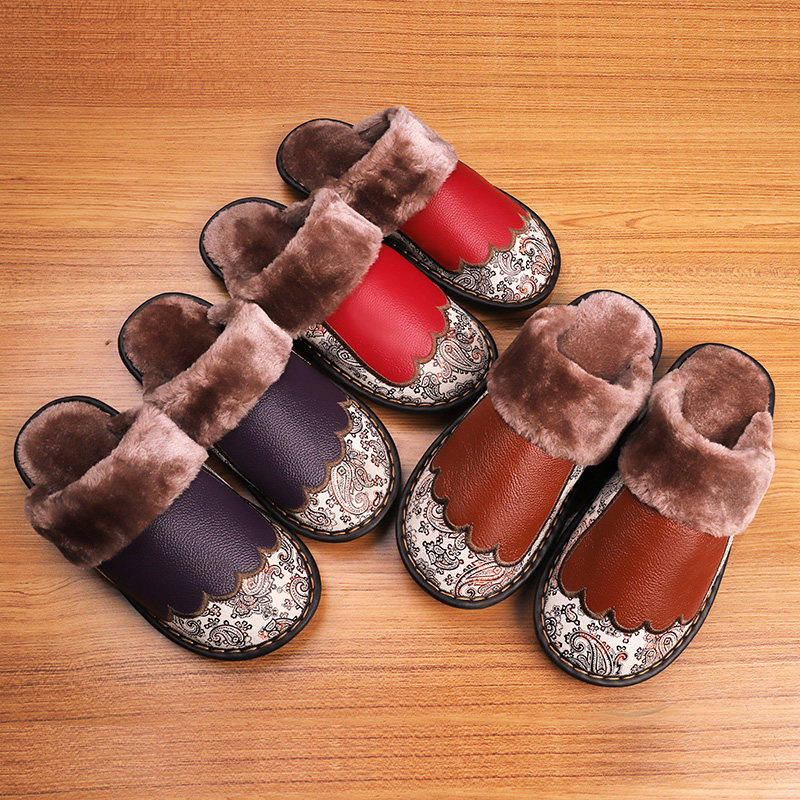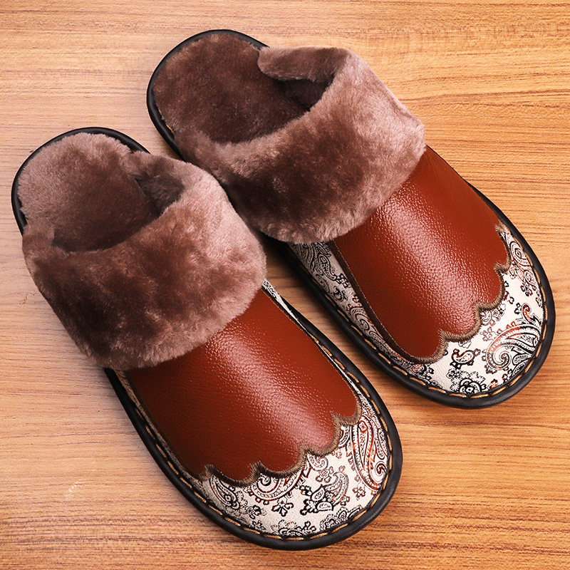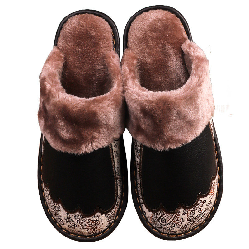 Genuine leather warm cotton slippers female winter home lovers non-slip thick bottom indoor floor embroidered fur slippers male