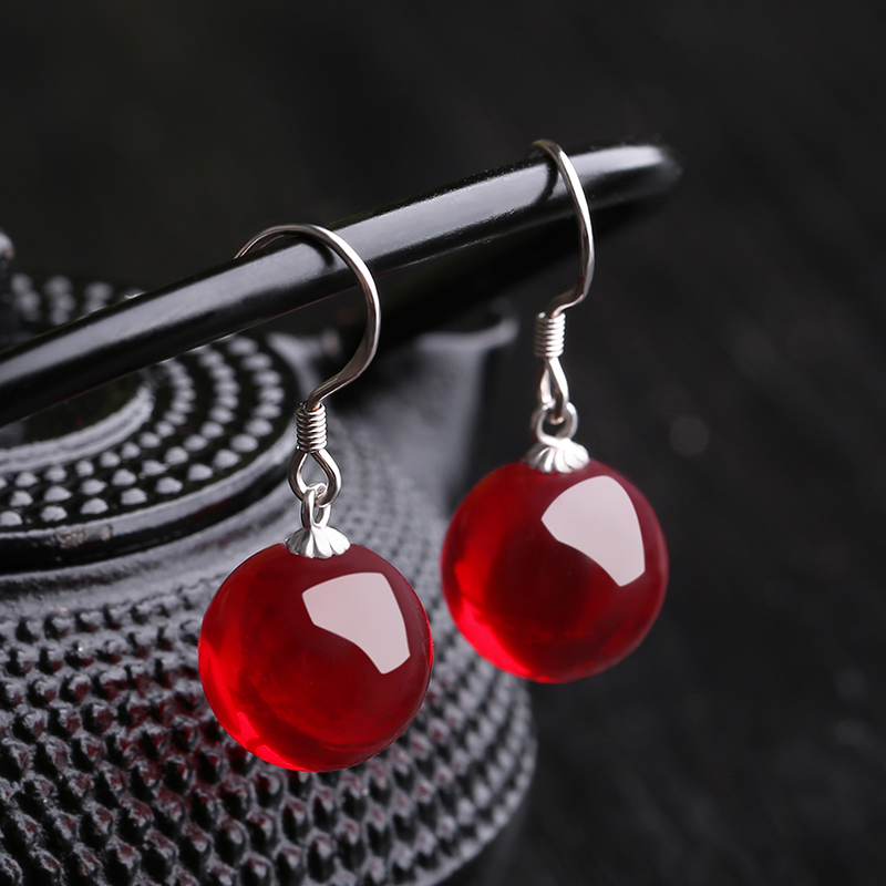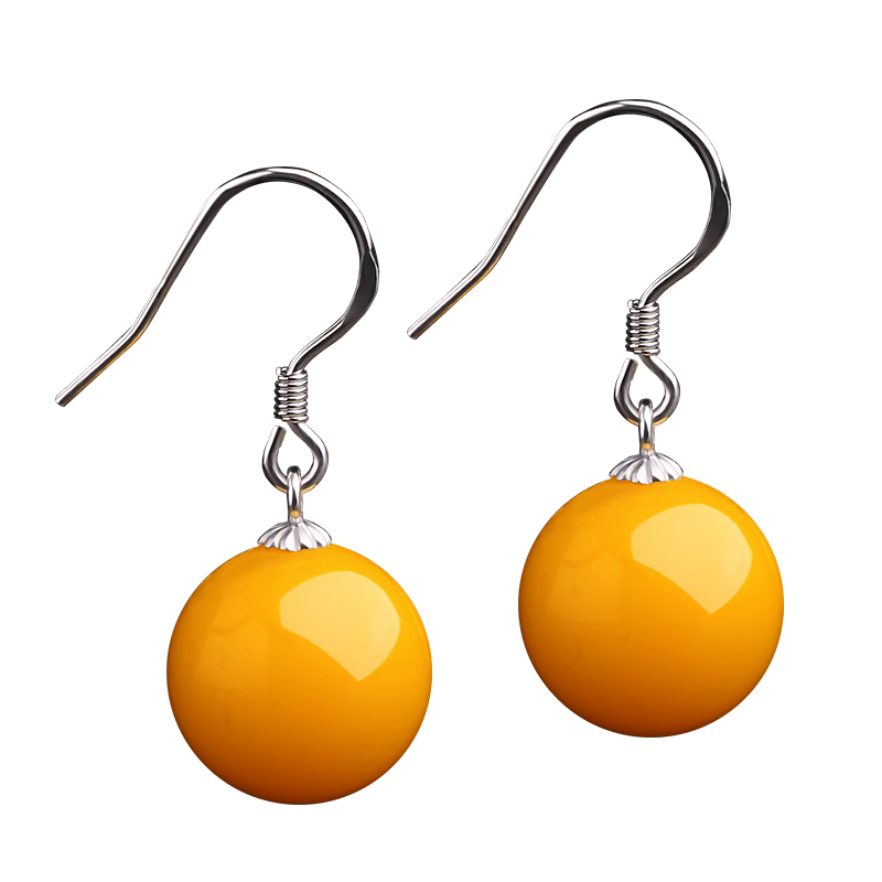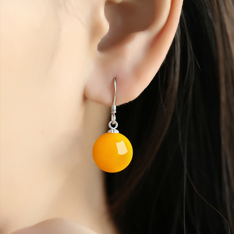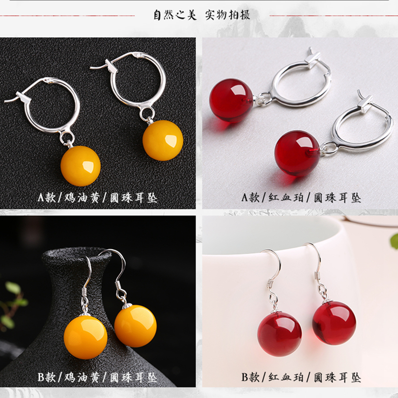 Natural Honey Wax Earrings s925 Silver Anti-Allergy Earrings Chicken Oil Yellow Round Pearl National Wind Ear Pendant Blood Peramber Ear Hook-Taobao