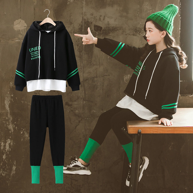 Girls' foreign style suit 2021 spring new middle and big children's hooded casual sweater leggings trendy