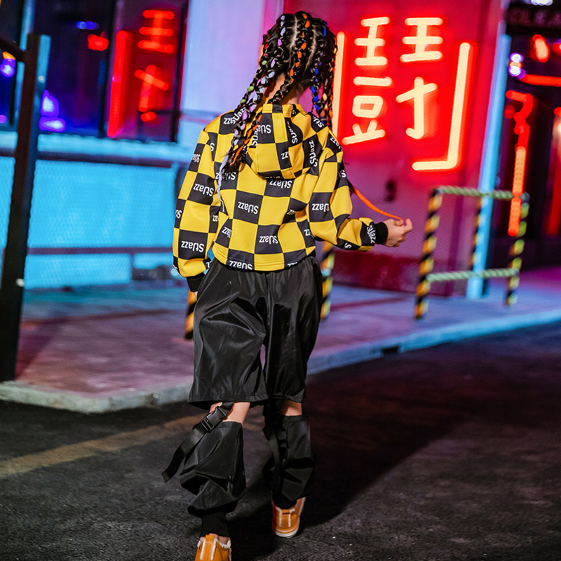 Yellow plaid top, black suspenders, yellow plaid top, black suspenders, black vest, yellow plaid top, black suspenders, white vest, silver short reflective vest-line clause, white back