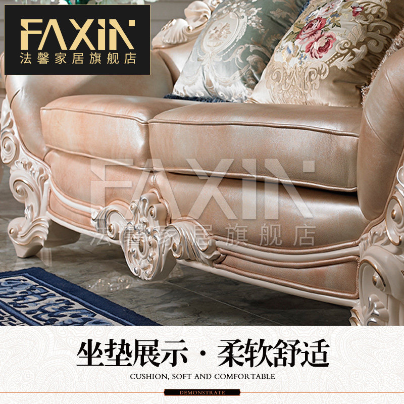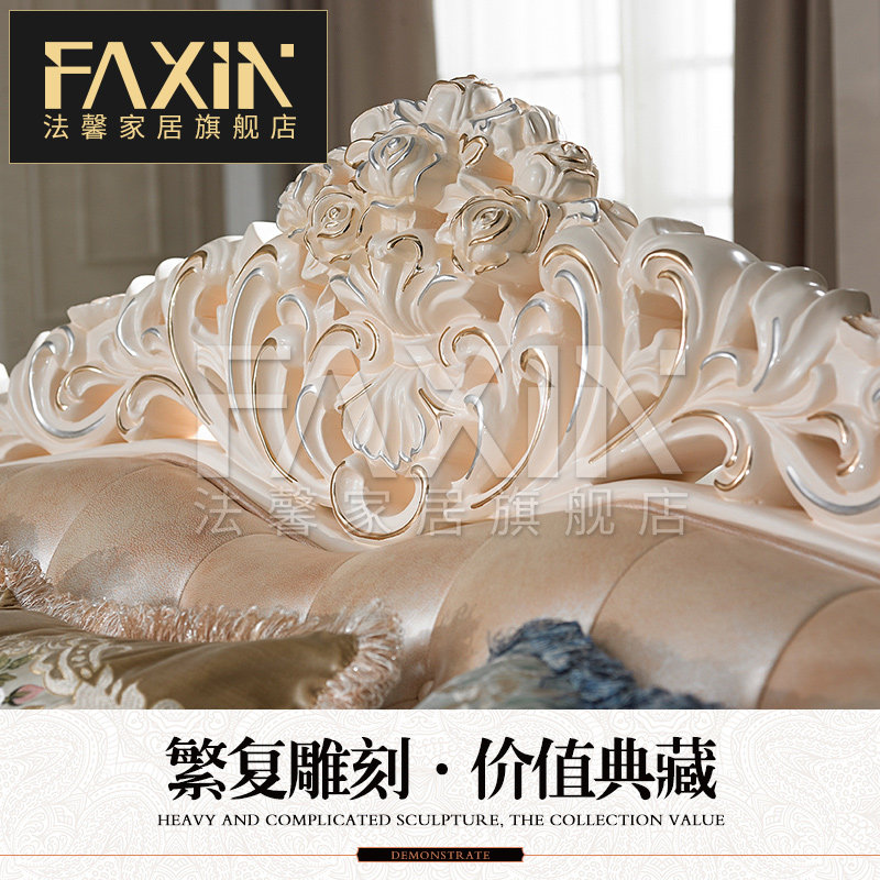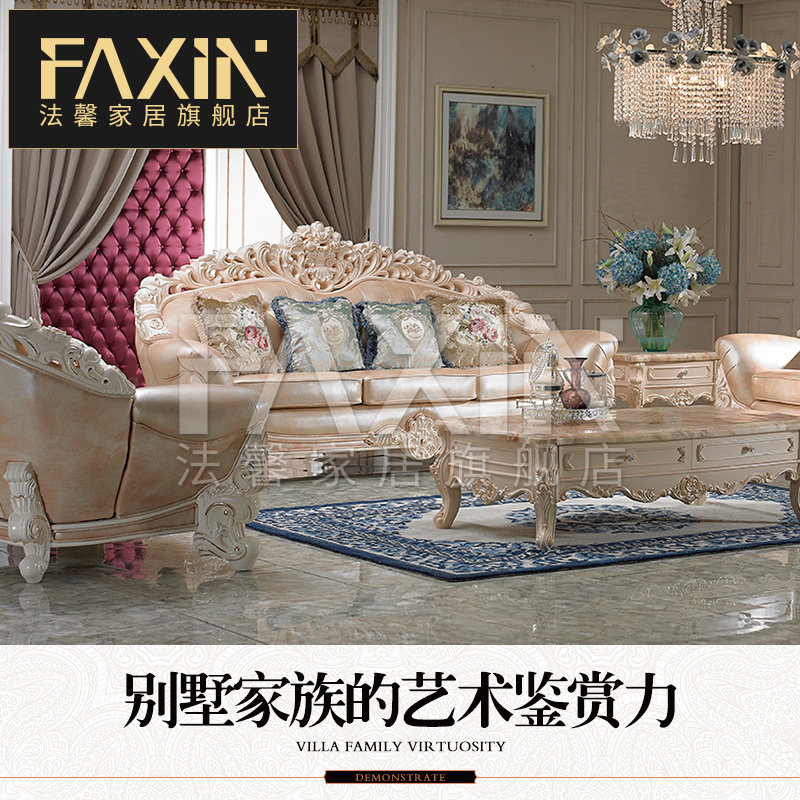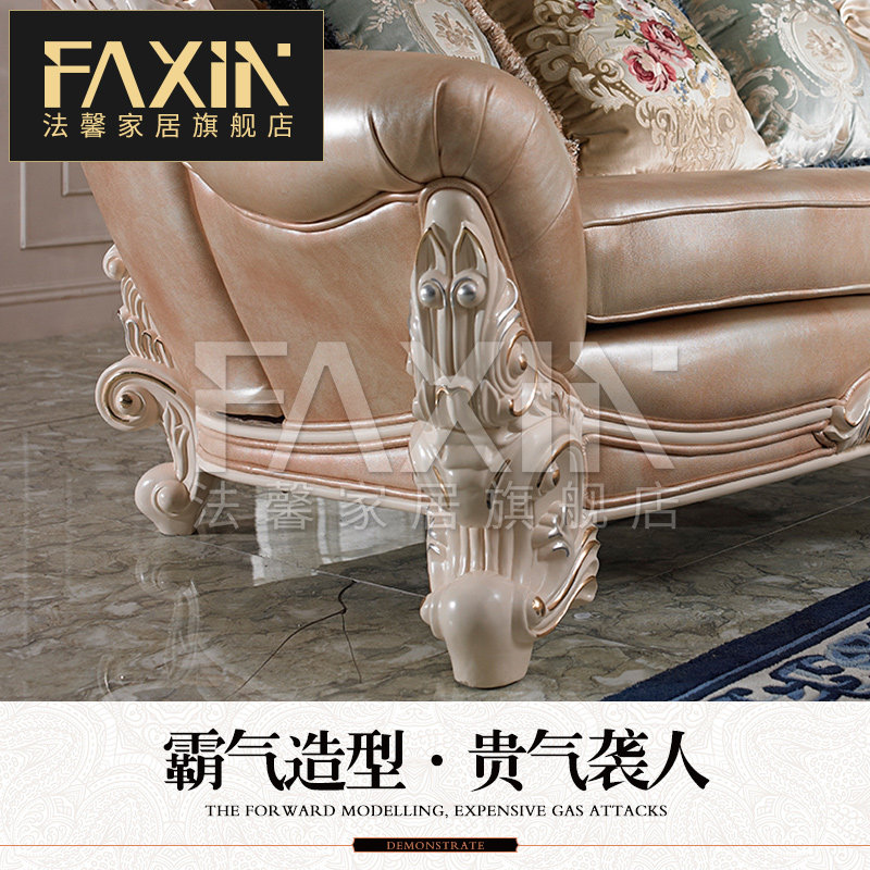 Faxin European - style sofa luxury villa hand - carved solid wood head - skin sofa living room furniture