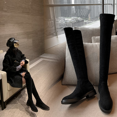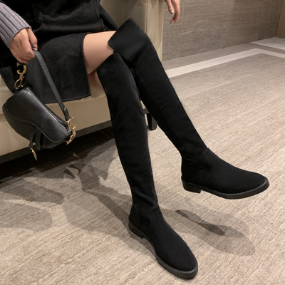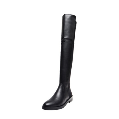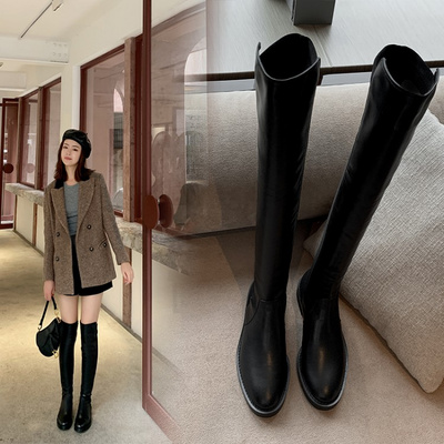 Leather classic boots, thin feet, long legs, flat bottom, knee boots, elastic boots, middle heel, thick, riding boots, female