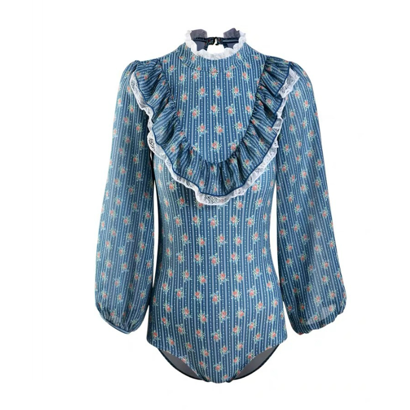 Shikeer 2022 high-collar French Super fairy blue lace long sleeve thin belly covered belly swimsuit women Hot Spring Summer