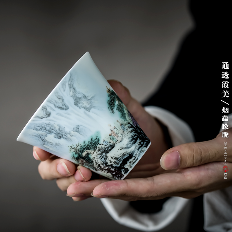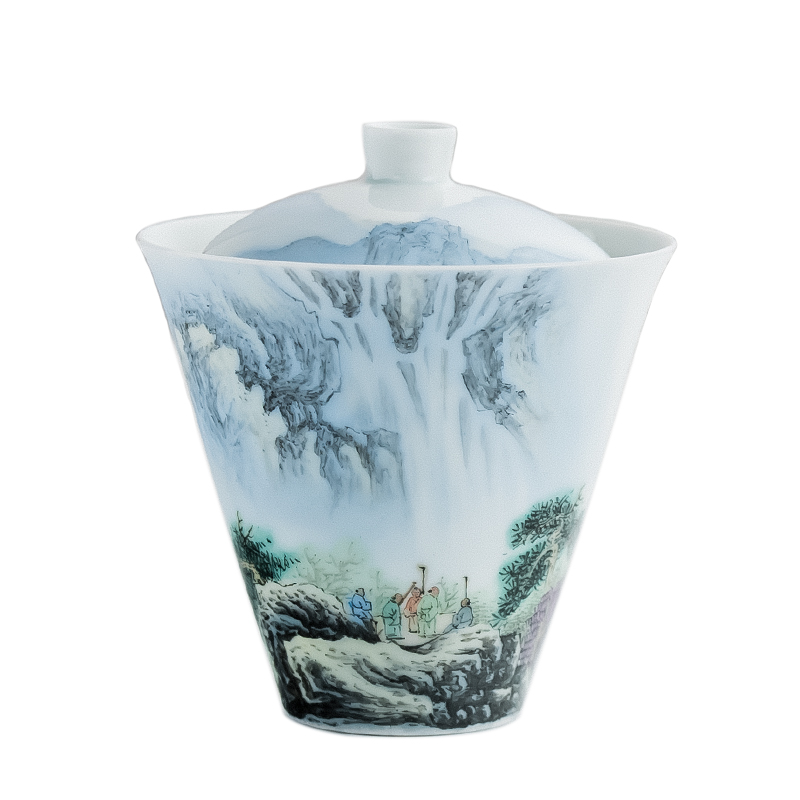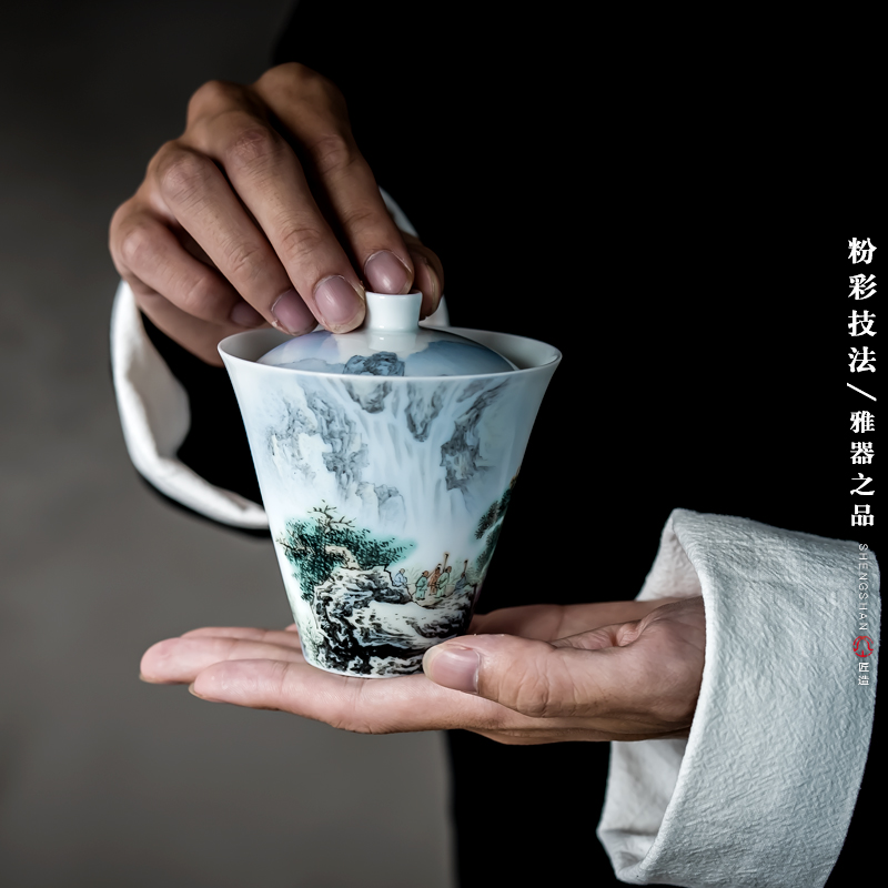 Holy Mountain pastel hand-painted ceramic tea lid bowl Jingdezhen kung fu tea set Chinese lid bowl white porcelain bubble tea lid bowl