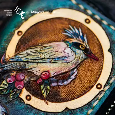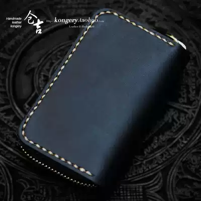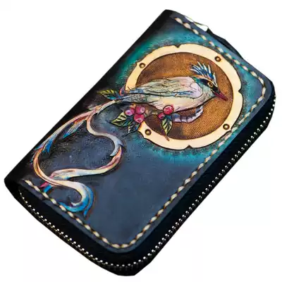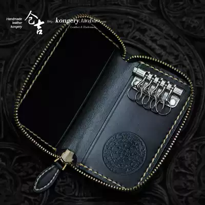 Cangji handmade key bag men's and women's vertical wallet zipper bag leather carved card bag head layer cowhide leather key bag