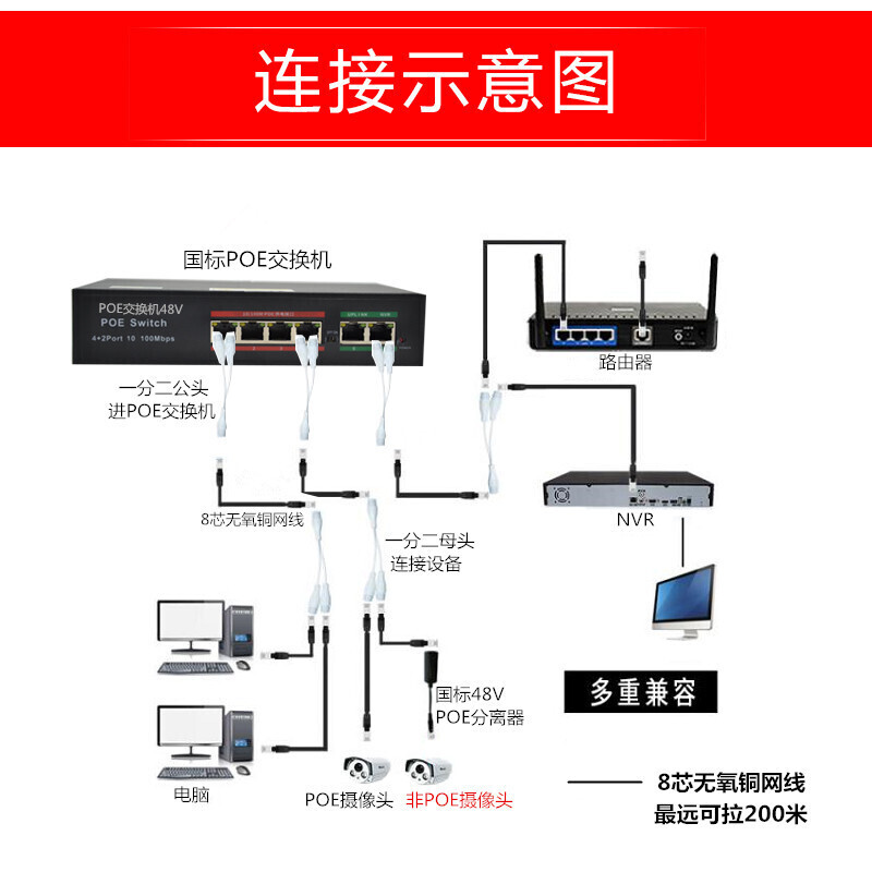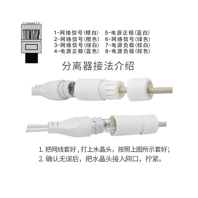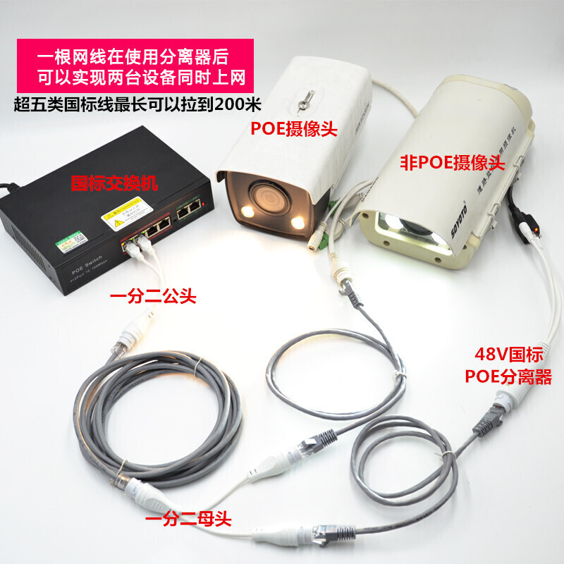One network cable is divided into two with two network camera splitters, and the power supply is stable for 200 meters under the national standard of category five