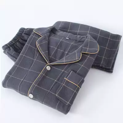 Pajamas men autumn and winter cotton air layer cardigan Plaid long sleeve air cotton cotton cotton home suit loose