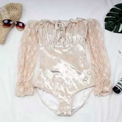 French velvet one-piece swimsuit Lace long-sleeved backless strap fairy fan small chest gathered hot spring vacation swimsuit female