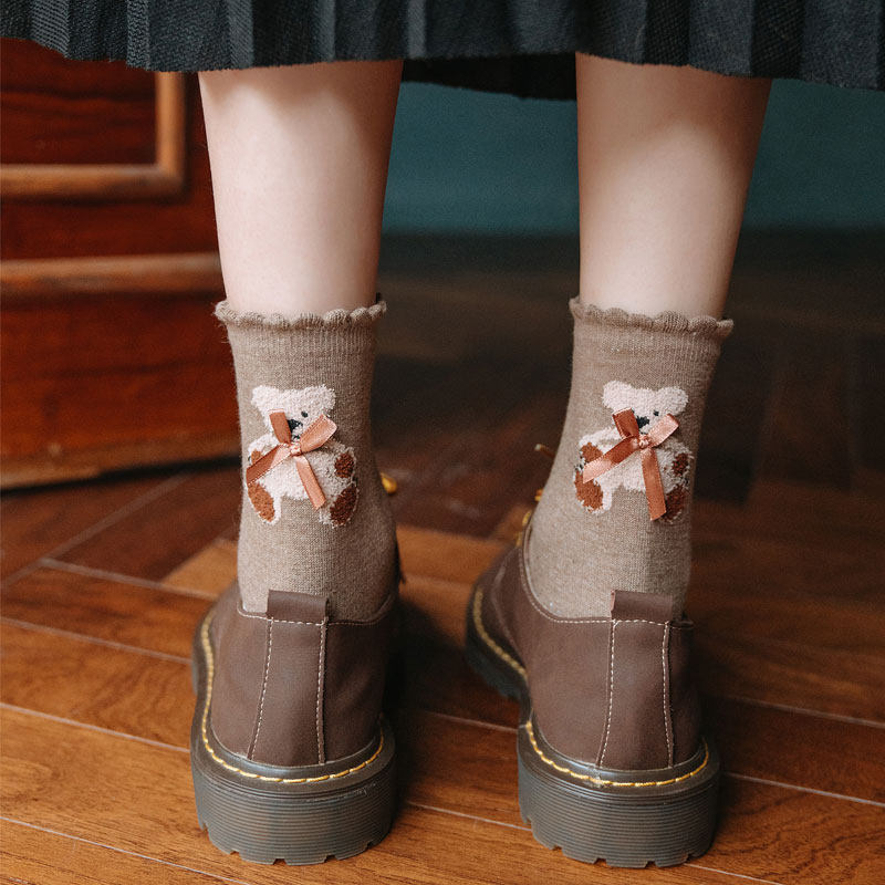 Socks women's middle tube ins tide autumn and winter cute three-dimensional cartoon bow bear heel Japanese net red wild