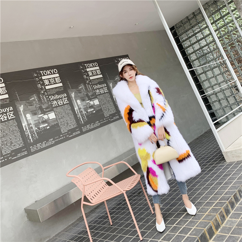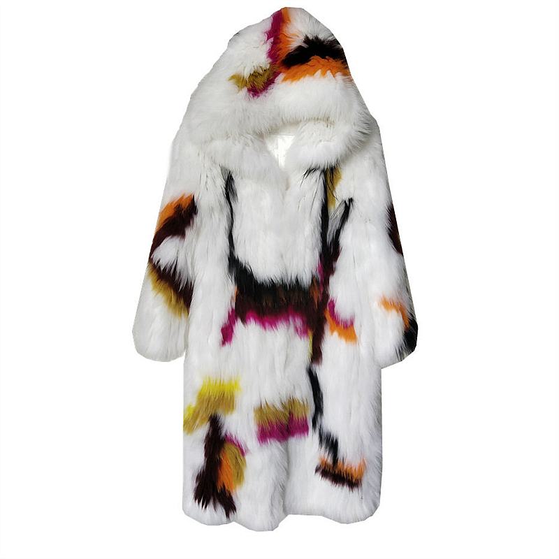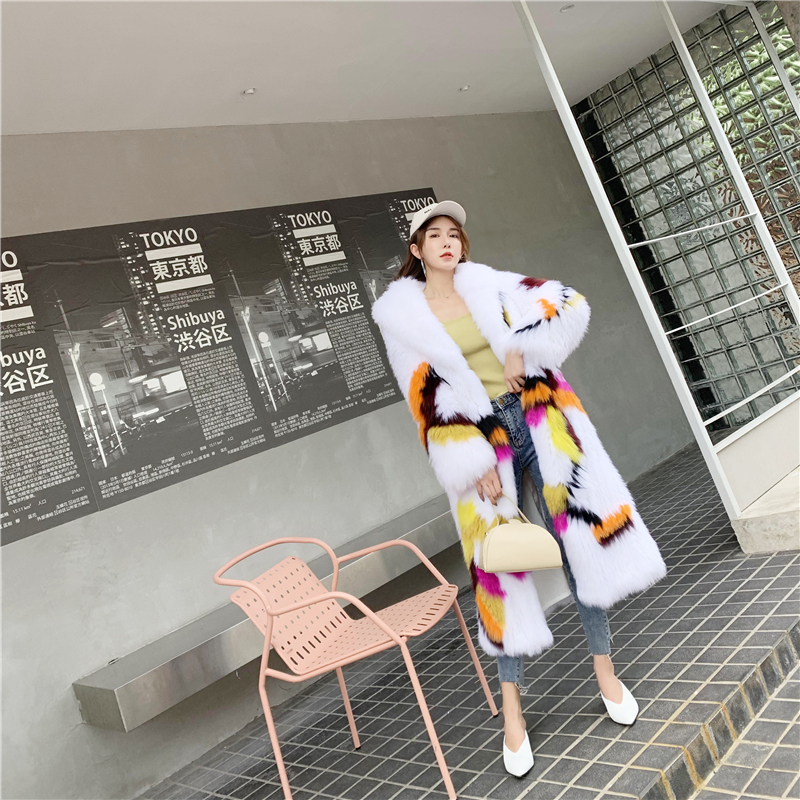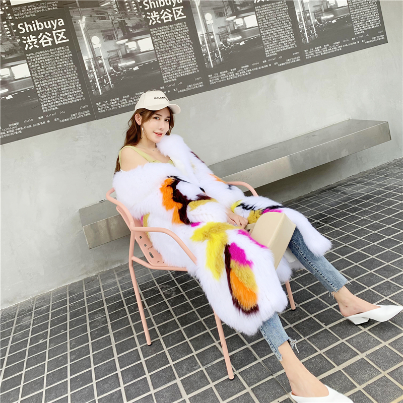 2022 new fur imported fox fur woven fur coat women's mid-length hooded fur coat contrast color woven