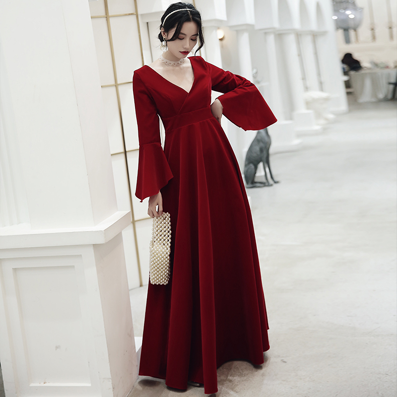 Burgundy velvet trumpet sleeves