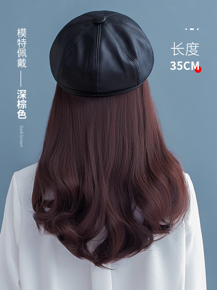 Net red PU leather hat wig one navy hat octagonal beret women's fashion autumn and winter medium long curly hair natural