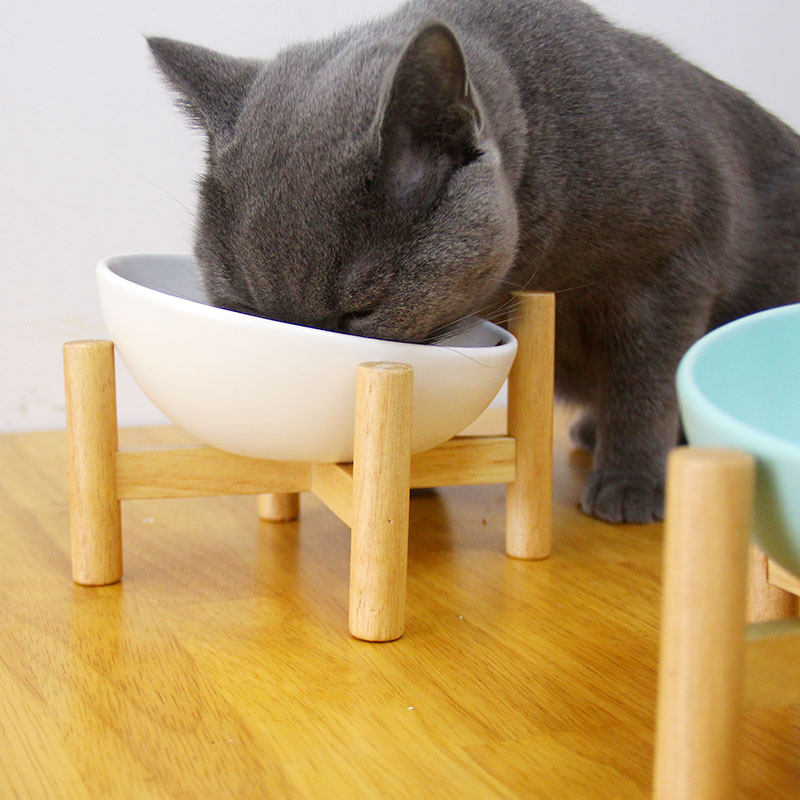 Cat bowl dog bowl cat oblique mouth bowl ceramic solid wood hanging cervical vertebra water bowl food bowl simple high kitten food bowl water