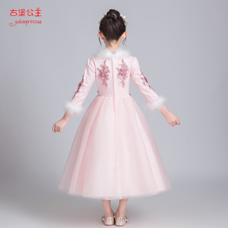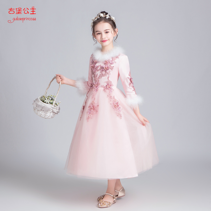 Flower girl dress female winter thickened wedding fluffy gauze skirt foreign style children's princess dress long-sleeved plus velvet birthday costumes