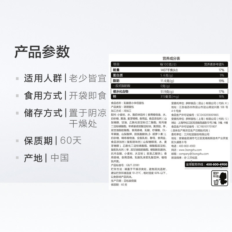 Three Squirrels Lactobacillus Bread 520gX2 Boxes Nutritional Breakfast Yogurt Pocket Snacks Shredded Bread