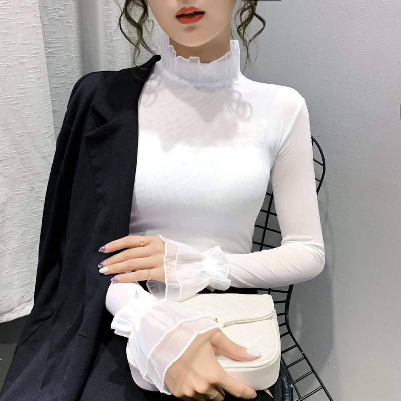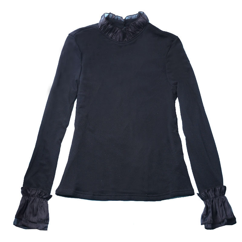 Lace plus velvety lace undershirt female blouse elastic to fix autumn and winter new horn sleeves with big code black and white