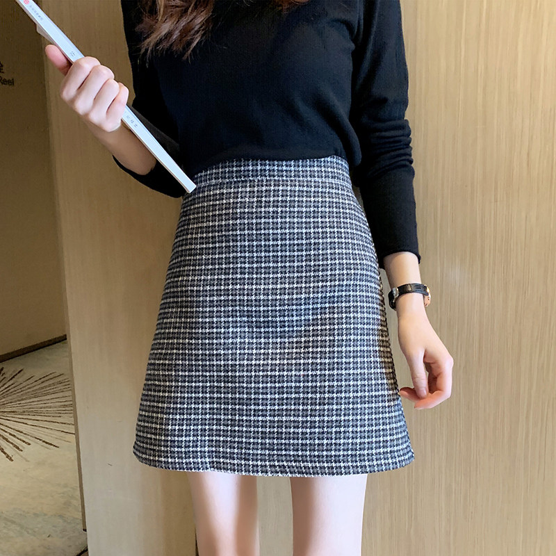 2022 autumn and winter new houndstooth skirt women's retro Hong Kong style high waist plaid skirt woolen bag hip a-line skirt