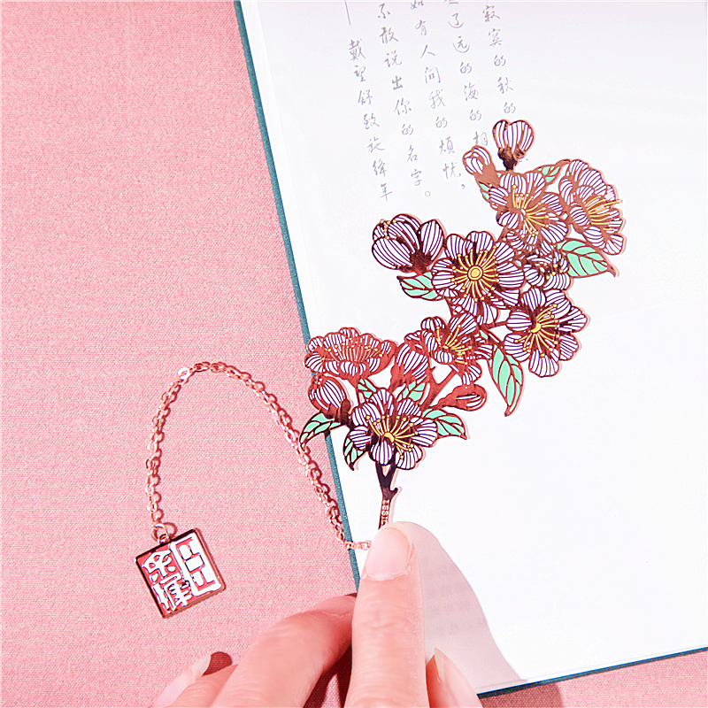 Fine Haitang Flower Bookmark Classical China Wind Hollowed-out Brass Metal Bookmark Creative Set Making twelve Flower Cherry Blossom Bookmark Gift Ventron small gift Souvenir Souvenir