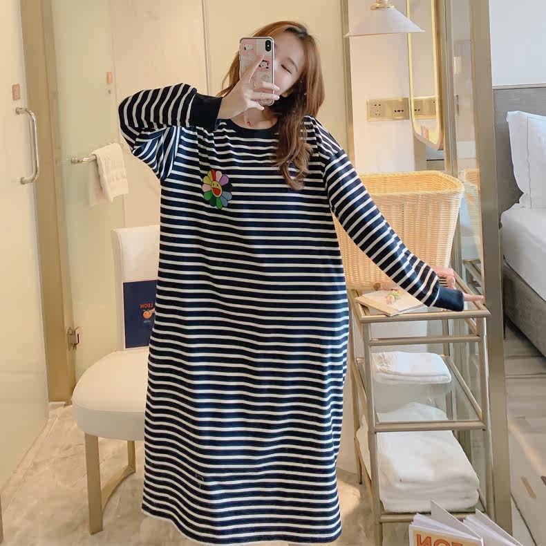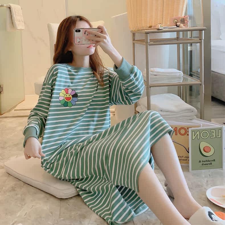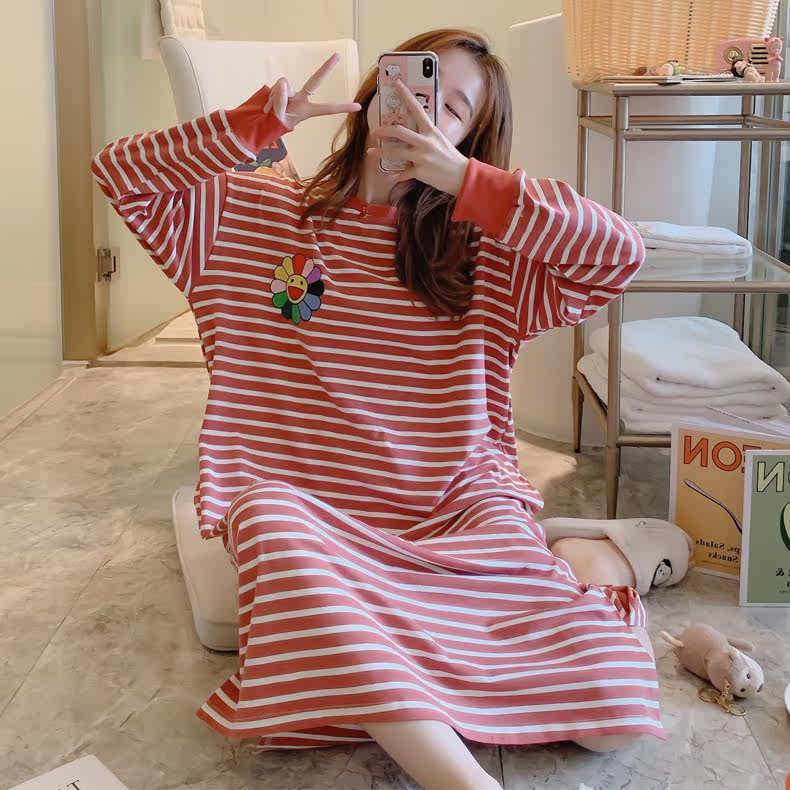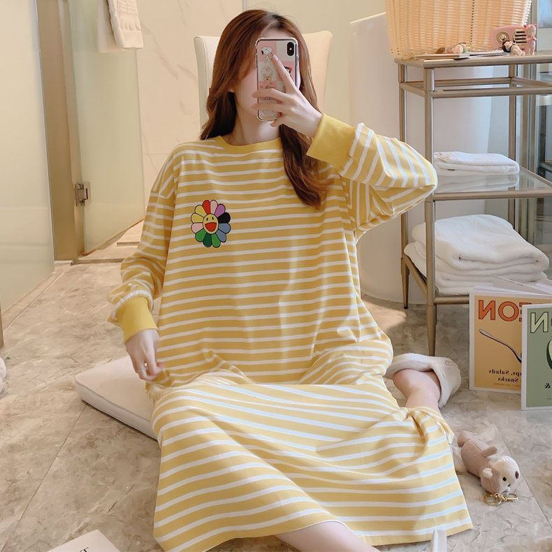 Long Sleeve Sleeping Dress Woman Spring Autumn Long Version Large Size Loose Sweet And Cute Sunflower Striped Pure Cotton Pyjamas Autumn Winter Skirt