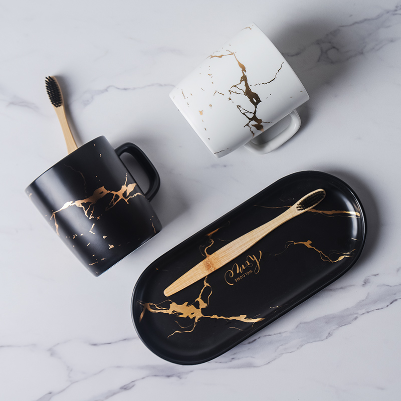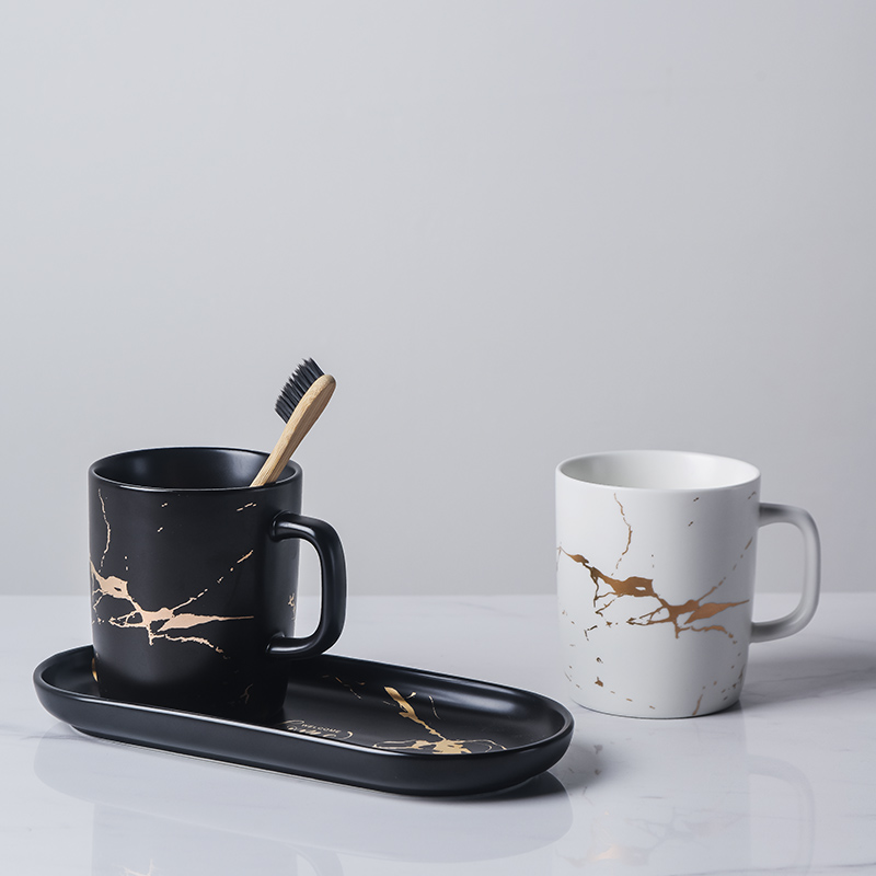 BLACK SINGLE CUP WHITE SINGLE CUP WHITE TWO CUPS WHITE MARBLE TEXTURED CERAMIC TRAY BLACK TWO CUPS BLACK MARBLE TEXTURED CERAMIC TRAY WHITE TRAY BLACK TRAY
