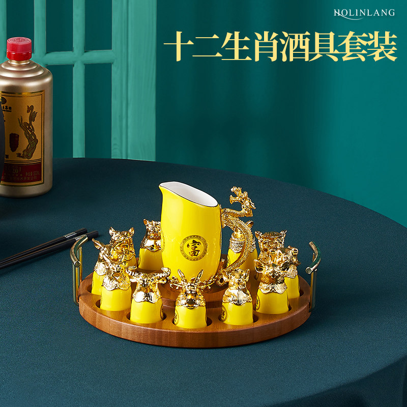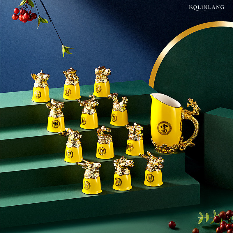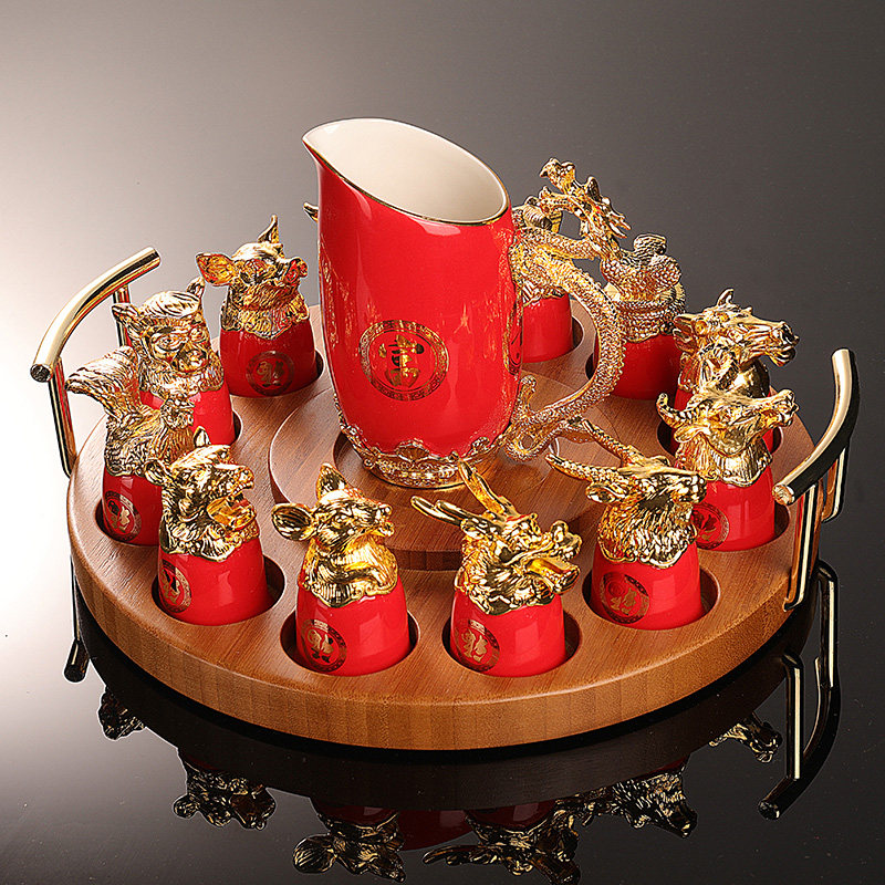 (Longfeng) Yellow Ceramic XII Zodiac Wine Cup - Super Box Red Ceramic Zodiac Single Cup 12 (Gift Box) (Longfeng) Yellow Ceramic XII Zodiac Wine Cup - Super Box Package Bamboo Oval Disk