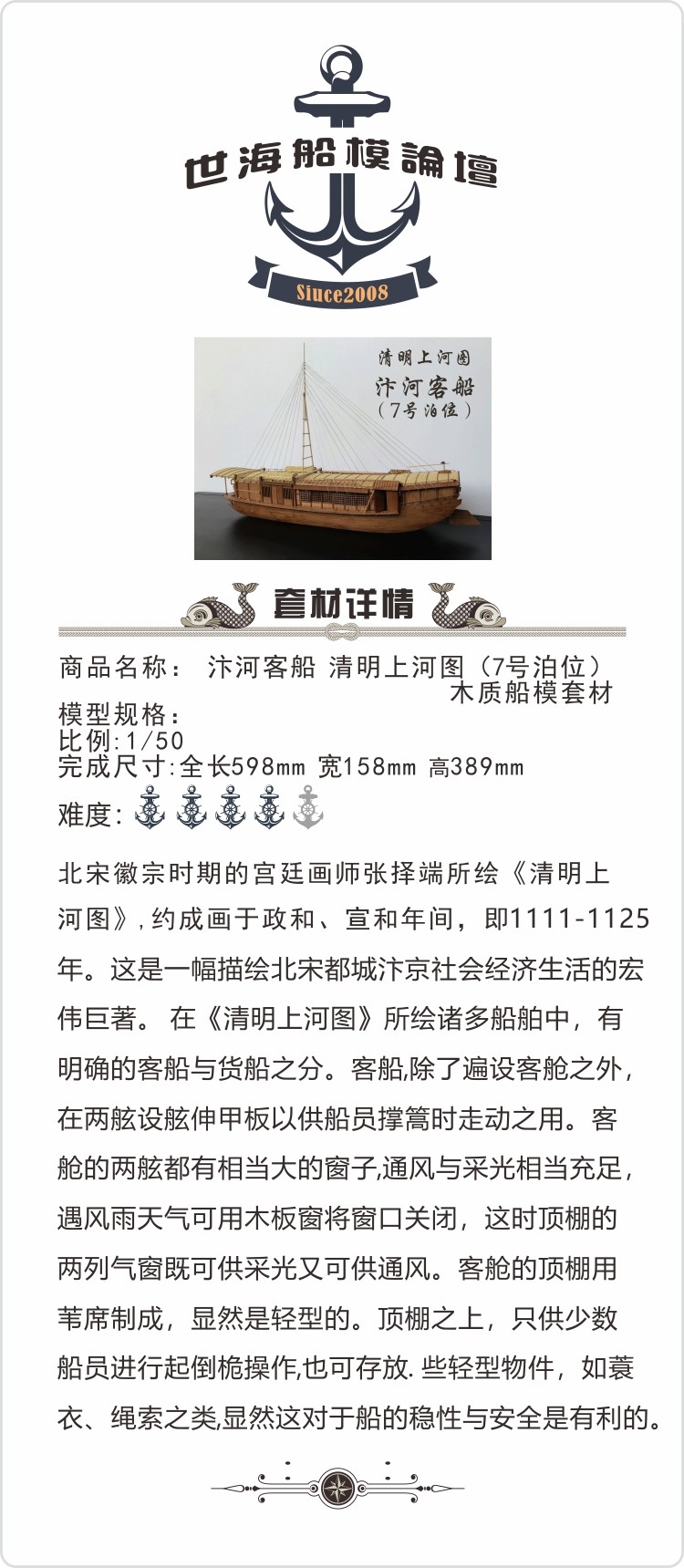 1 50 Bian River Passenger Ship (No. 7 berth) Sailing China Ancient Ship Model Kit in River Map on Qingming River