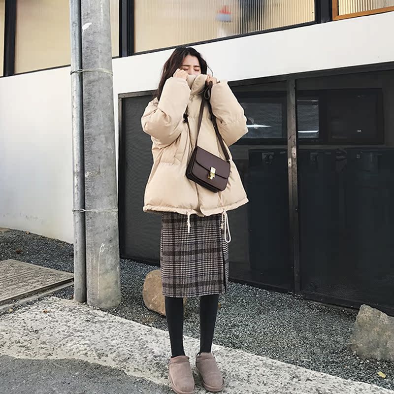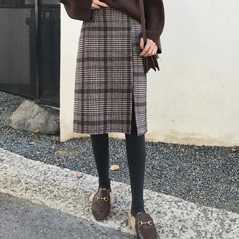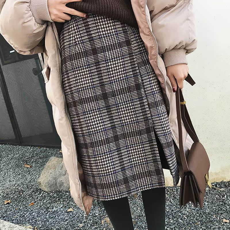 Hairy plaid half body dress female autumn and winter temperament retro medium long version of the body slim and high waist open fork one step bag gluteal skirt