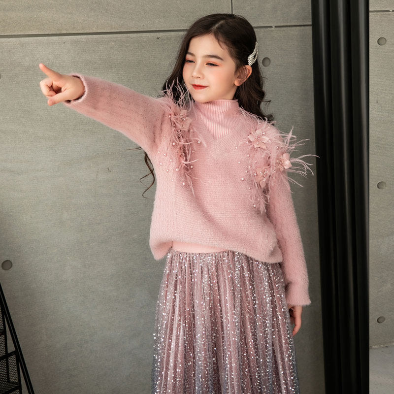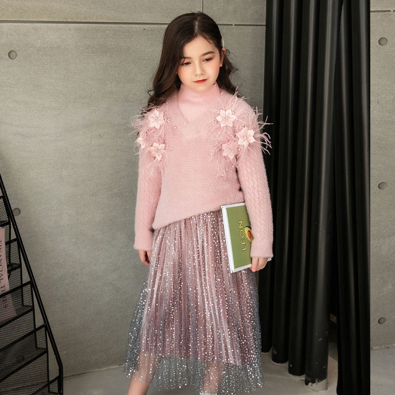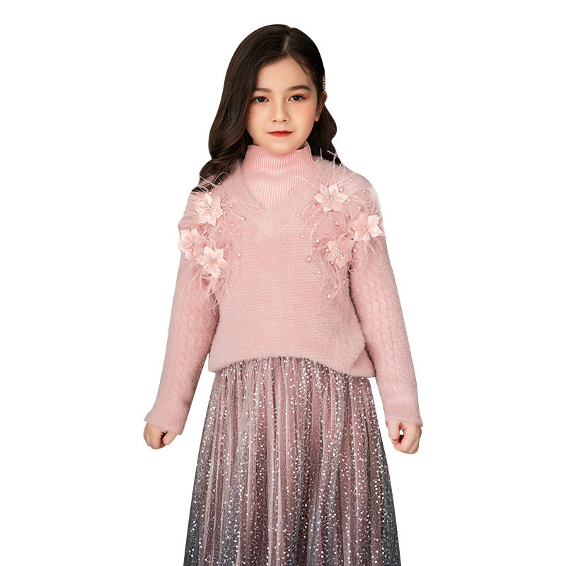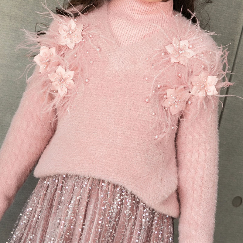 Girl Kit with Mink Han Pearl Flower Sweater Golden Velvet Web Dress Pink Lady Two Piece Set