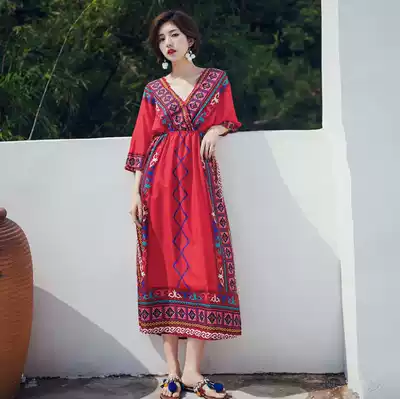 Thai national style sand beach dress female summer new seaside vacation thin tourism red bohemian long skirt