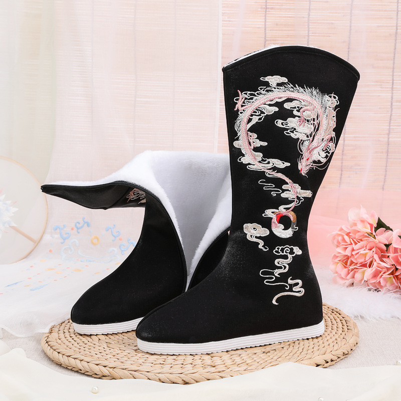 Xuan Mo Ge dragon pattern spot autumn and winter antique embroidery drag flying fish Hanfu Inner height plus velvet middle tube boots