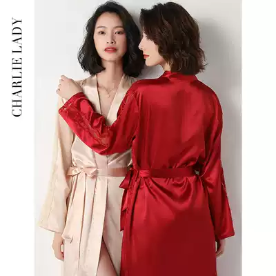 Spring and autumn winter pajamas Lady Ice Silk robe long version Red Wedding bride morning gown bridal dress wedding wedding wedding wedding