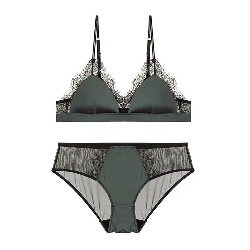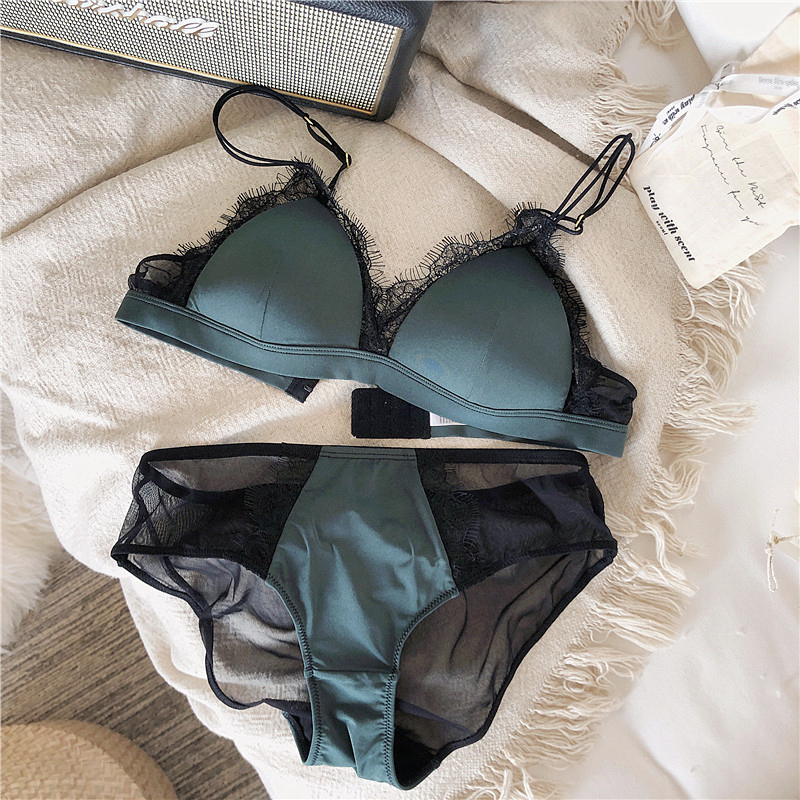 French eyelash lace Sexy triangle cup without rims Gather big chest show small thin belt Underwear suit Underwear bra