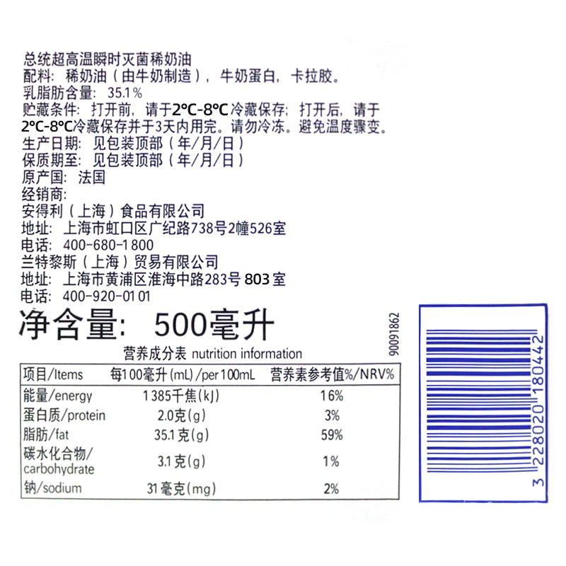 President Light Milk Oil 500ml Animal rare cream Home Diluted Cream Milk Bubble Machine Framed small packaged baking material