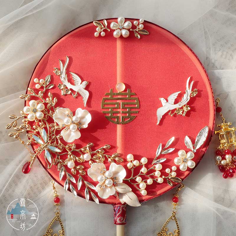 Xuetingfang Shuangfei Yan ancient style short handle Chinese group fan Bridal wedding gift wedding hand-held happy fan Handmade wedding fan