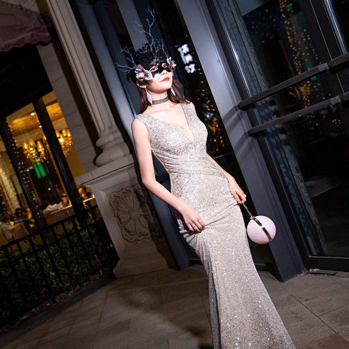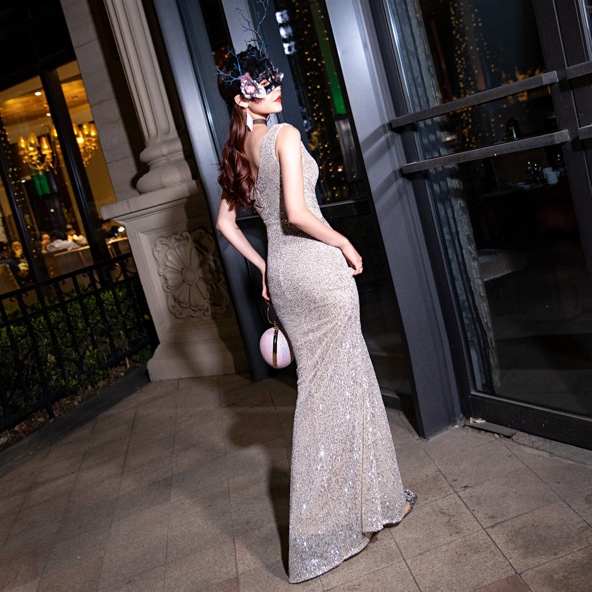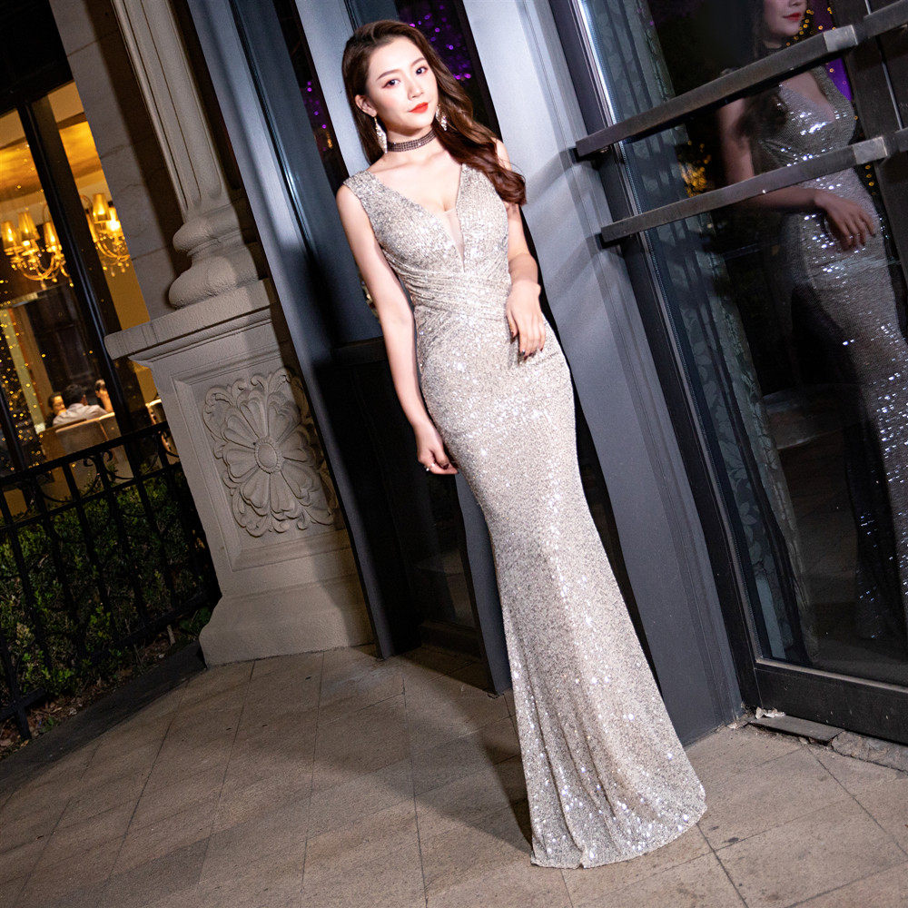 New evening dress women's new banquet noble temperament elegant annual meeting long host deep V fishtail sequins sexy