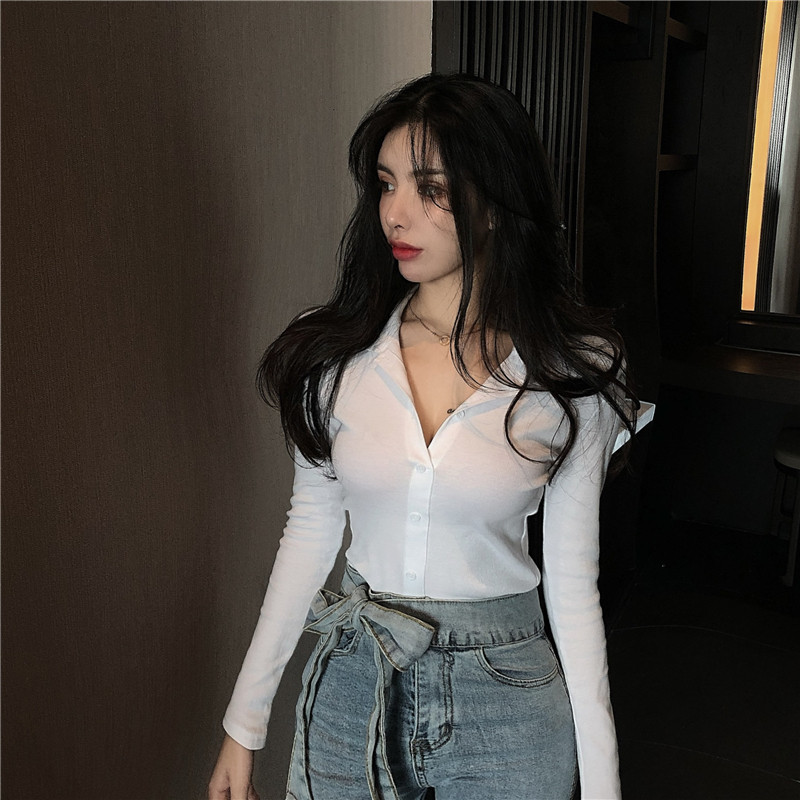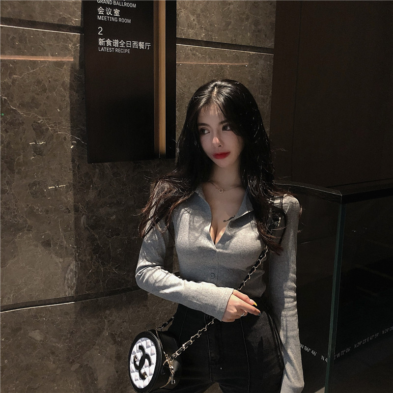 Pure desire casual POLO collar bottoming shirt women's solid color long-sleeved high-waisted front-shoulder T-shirt pullover single-breasted tights
