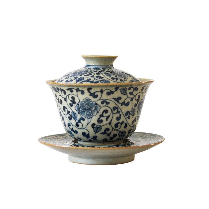 Duqing blue and white wrapped lotus three-cai cover bowl Ceramic Jingdezhen handmade bowl with lid cup tea set tea bowl