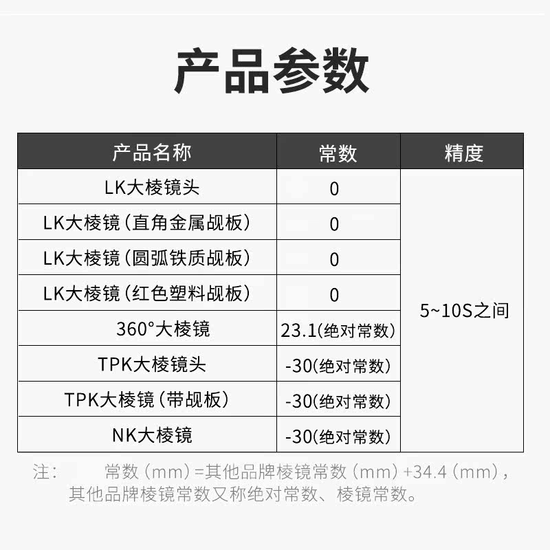 LK large prism lens LK large prism (right angle metal plate) LK large prism (red plastic plate) LK prism (arc iron plate) 360 ° large prism LK large prism + adapter TPK large prism (with a board) optical base optical base + with connector 2. 15m Alignment Bar Bracket + TPK Large Prism CD2L Bracket + 2m Pole + TPK Large Prism CD3L Bracket + TPK Large Prism CD3L Bracket + A Adapter + LK Large Prism Leica Special Alignment Bracket + LK Large Prism 2 m Pole + A Adapter + LK Large Prism CD2L Bracket + 3 m Pole + TPK Large Prism CD2L Bracket + 5 m Pole + TPK Large Prism NK Large Prism (with Flip Board) Single Base Box Base Box + Base + LK Large Prism