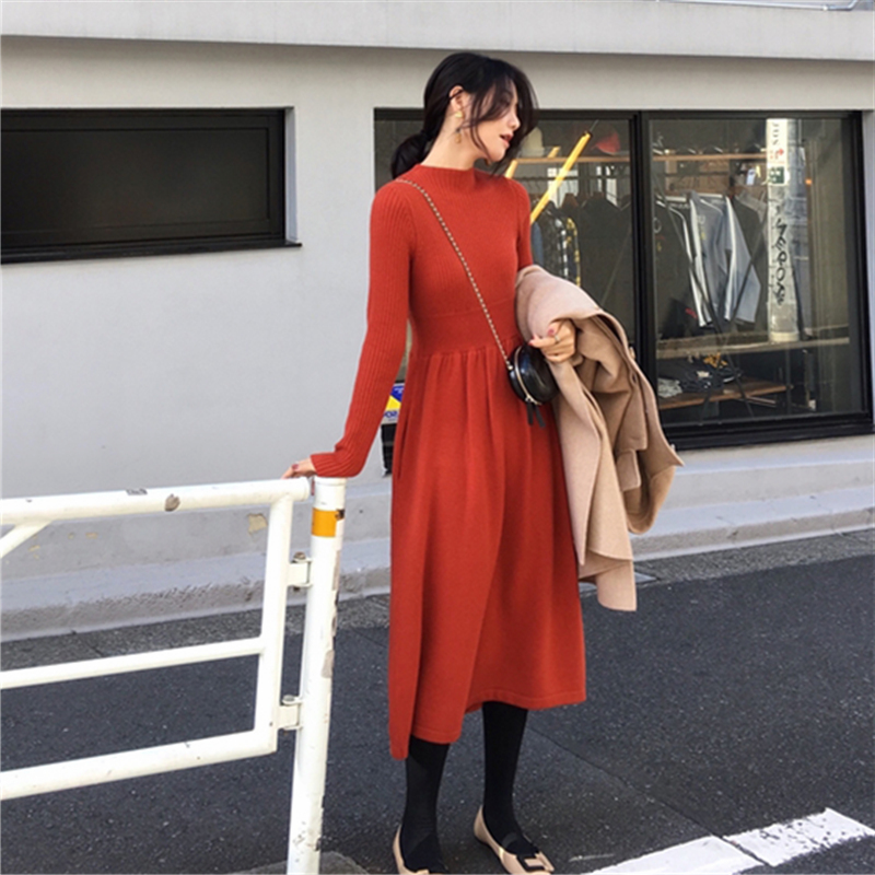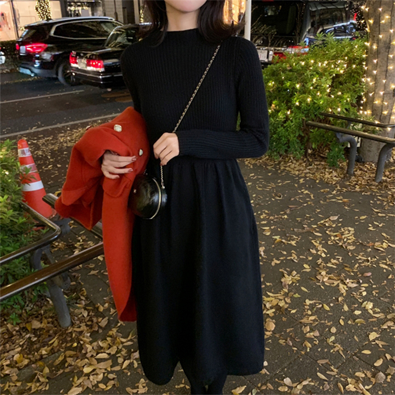 Long skirt with overcoat Long sweater skirt over the knee Korean version of inside knit inside dress women's fall/winter fake collar