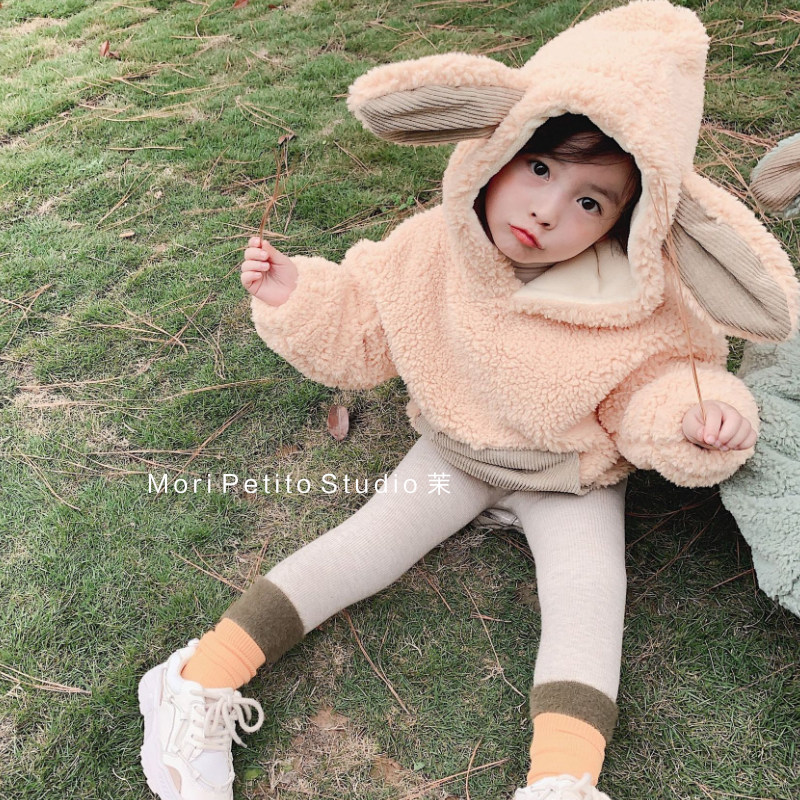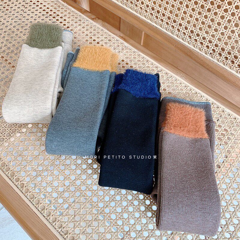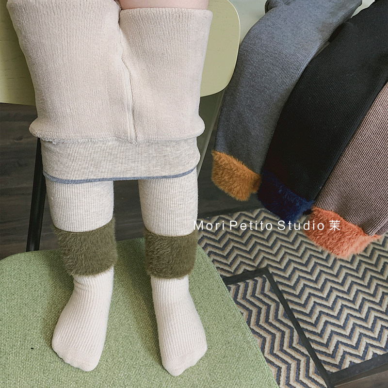 Cute girl knitting and piece of mink fluff in trousers in thick wool baby wearing pants outside wearing winter