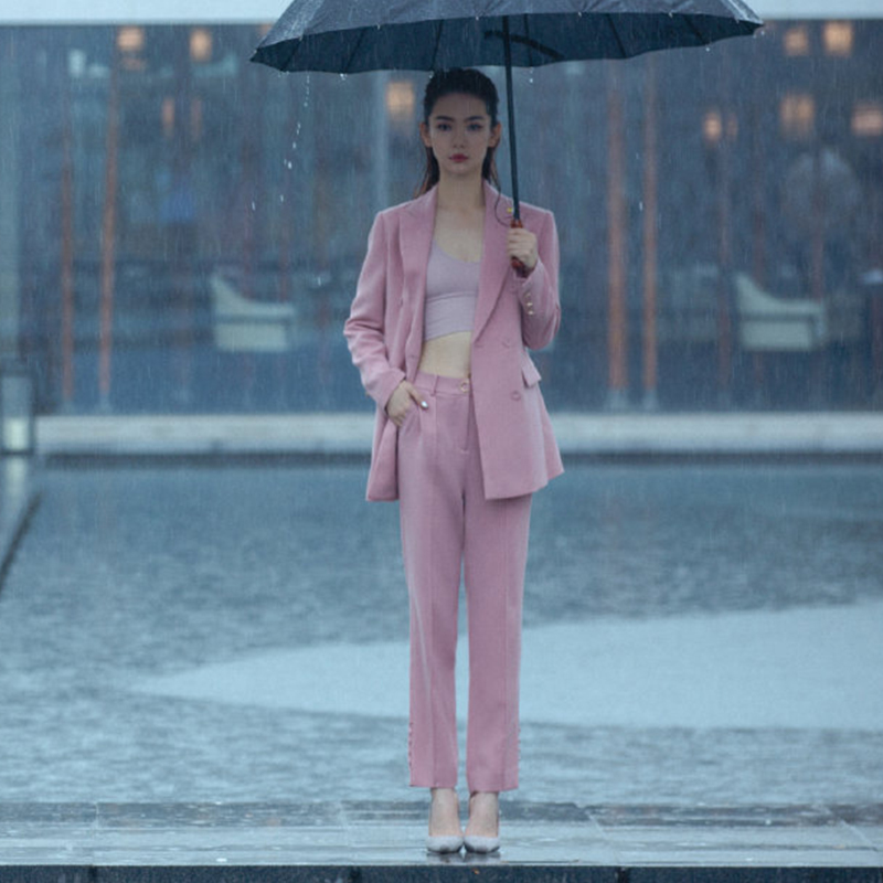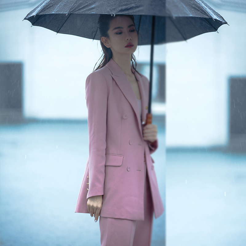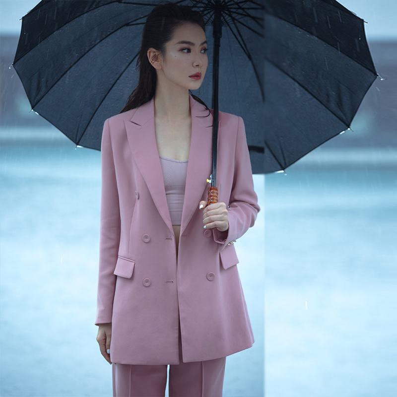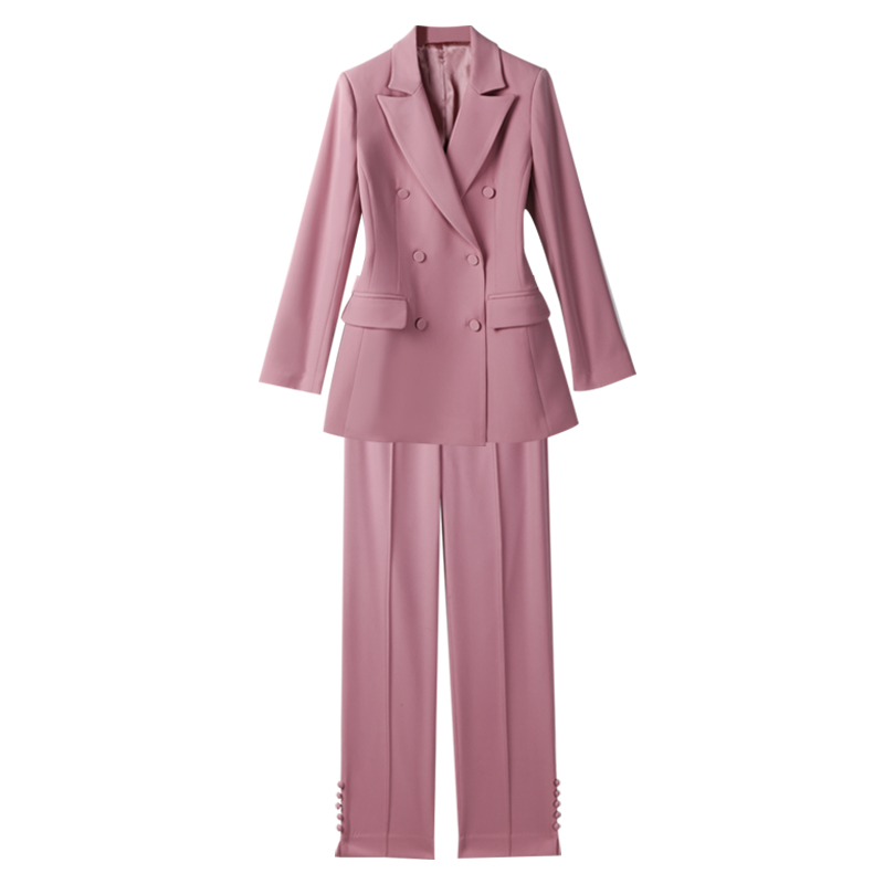 Fashion Qi Wei with the same professional coat double-breasted pink suit temperament slim cigarette tube pants two-piece set of women