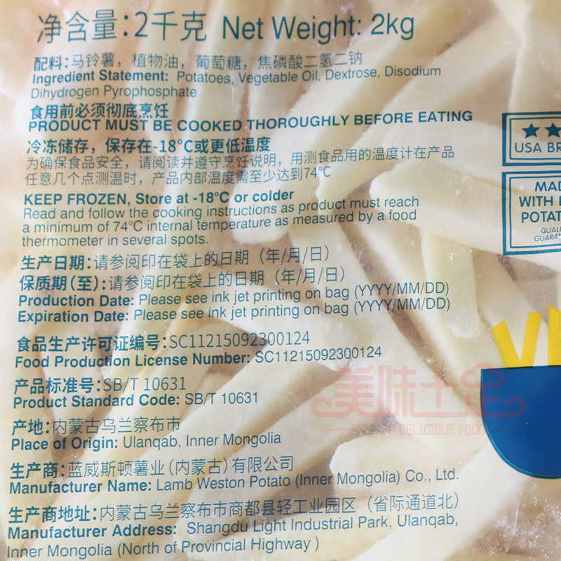 Whole box Blue Weston frozen rough fries 2kg * 6 bags LS308 3 8 coarse fries oil fried fries