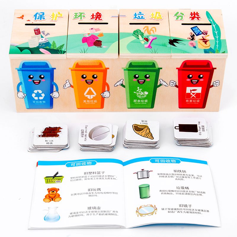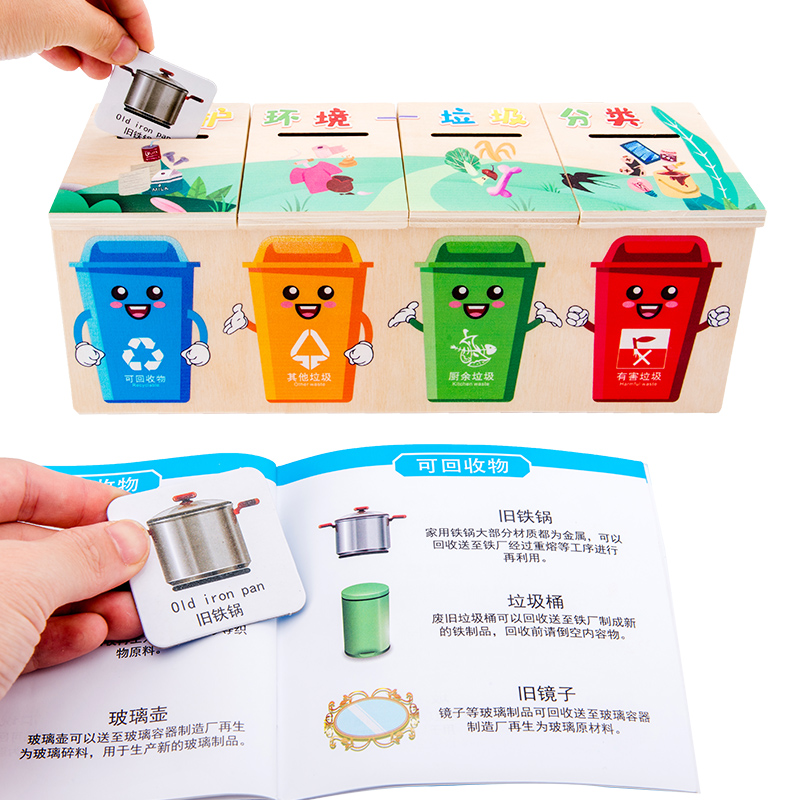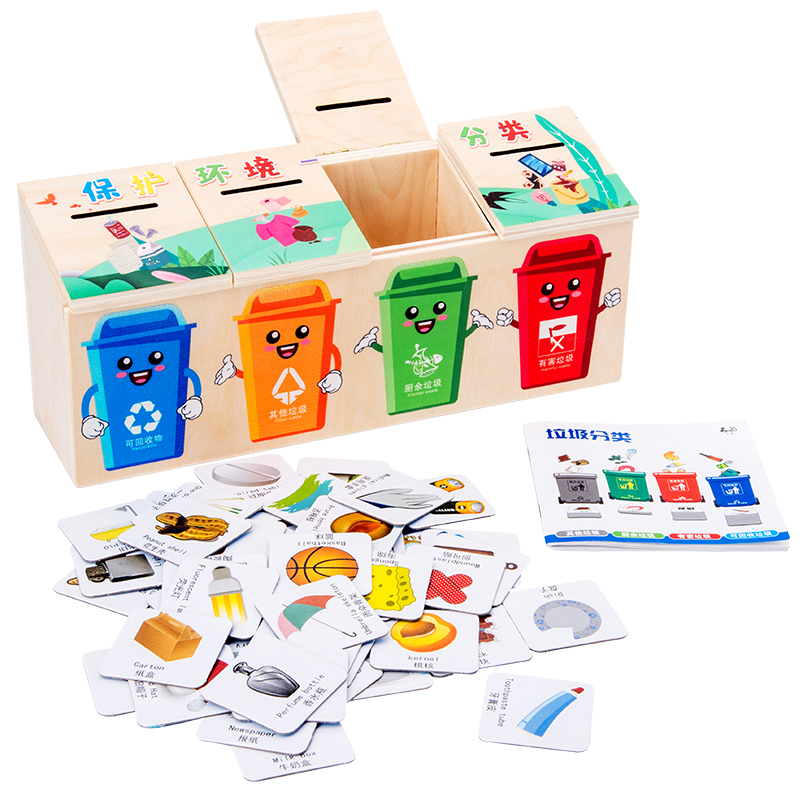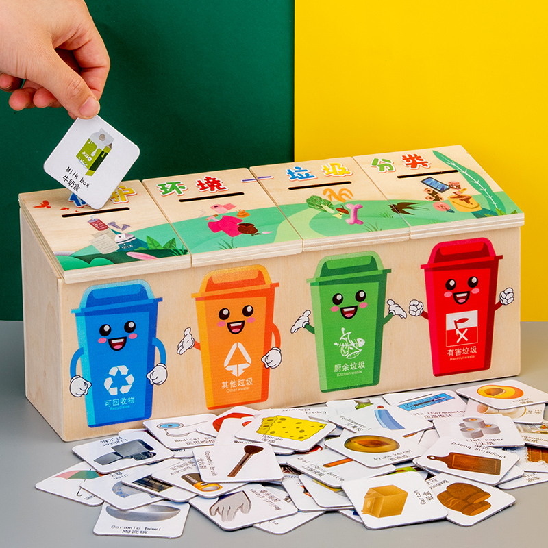 Children Early Education Wooden Trash Sorting Environmental Protection Community Cards Bag Trash Can Props Kindergarten puzzle desktop