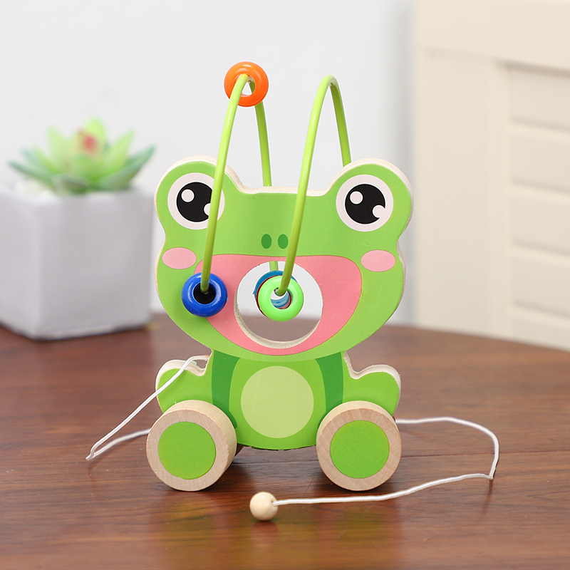Blue elephant dragging around the bead Yellow lion dragging around the bead Blue hippo dragging around the bead Green frog dragging around the bead