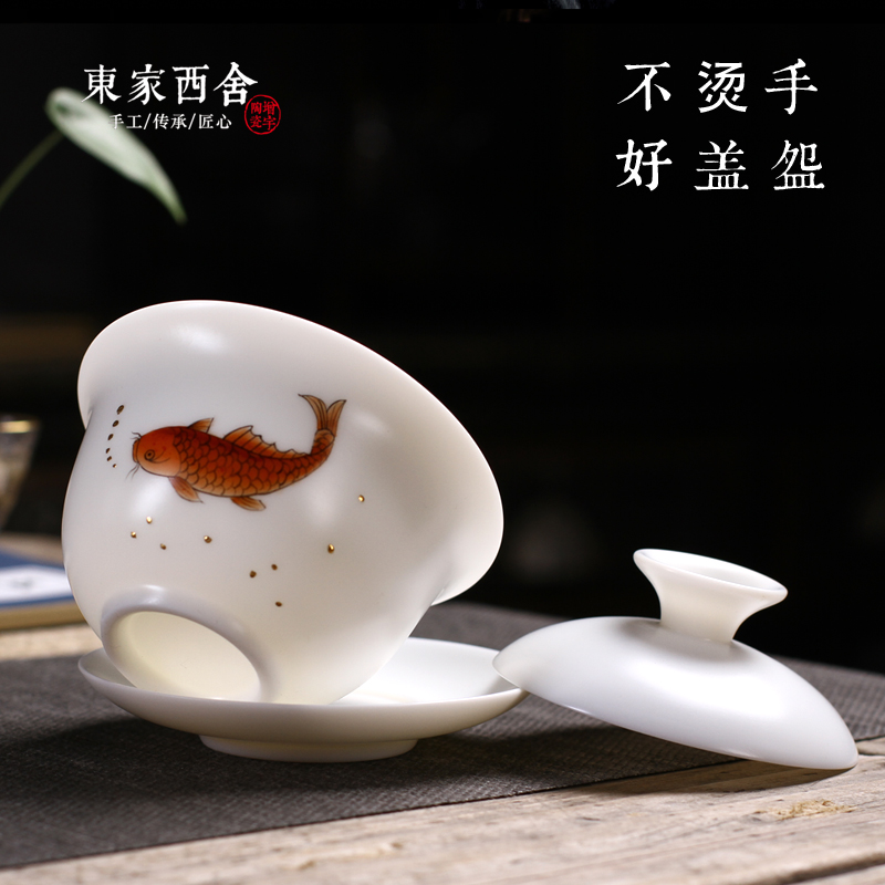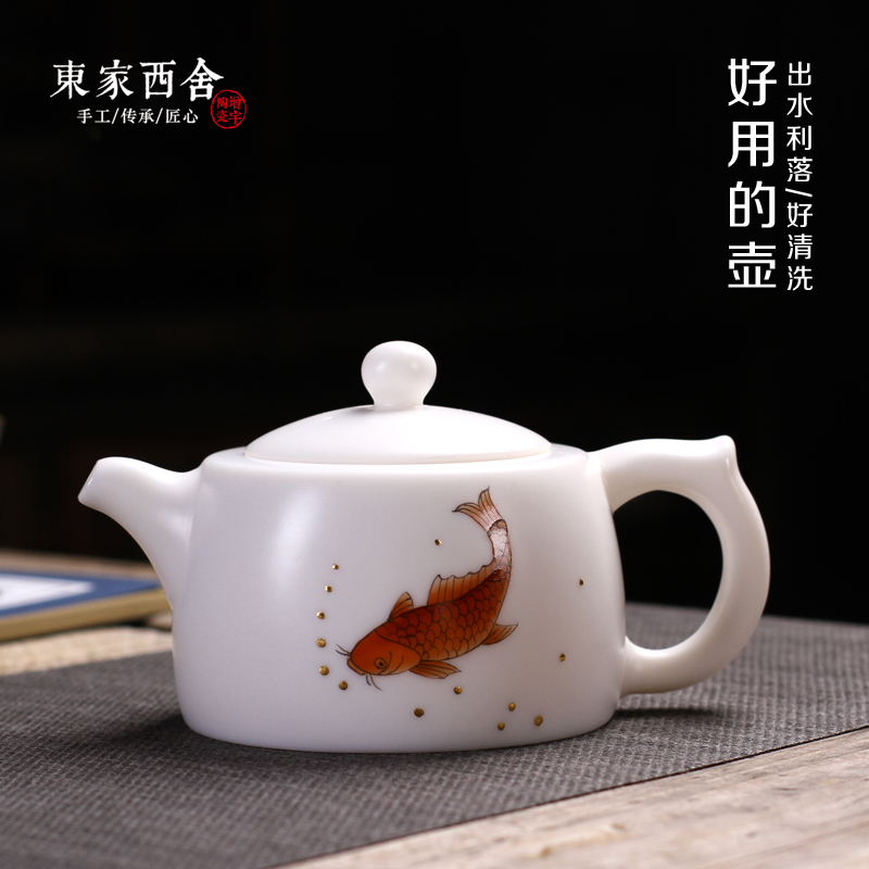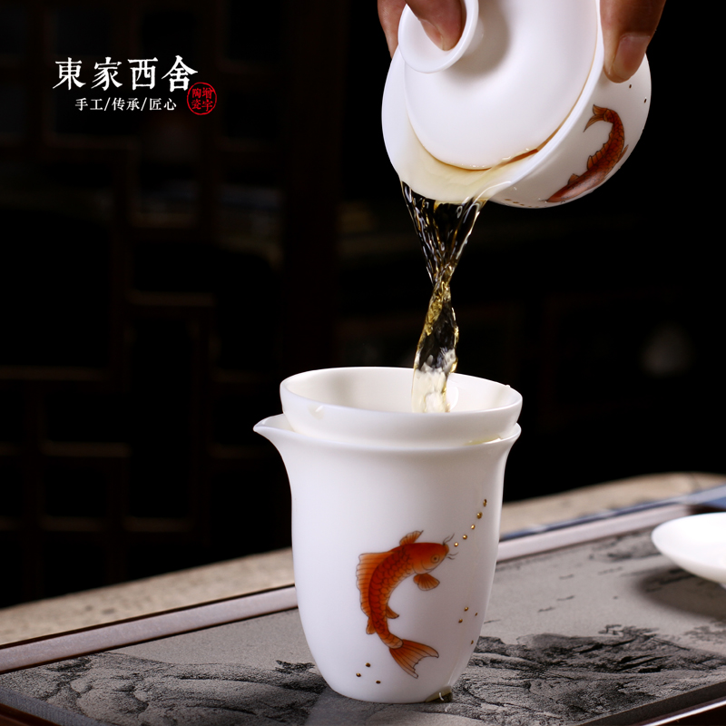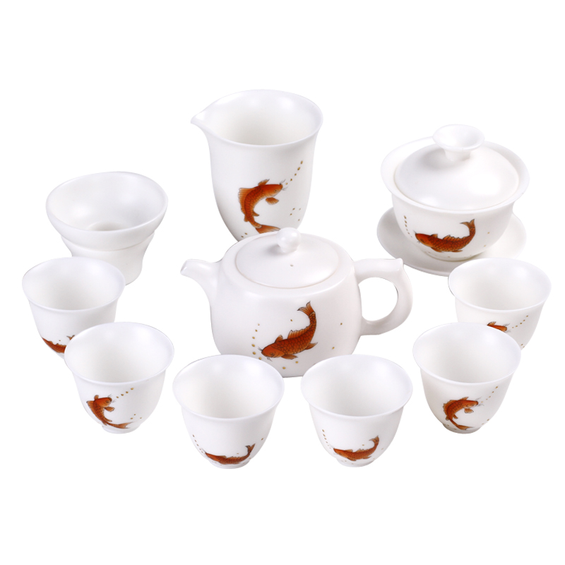 Dehua white porcelain tea set group year with fish hand - covered cup teapot 6 people Kung fu teacup amniotic ceramic gift