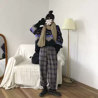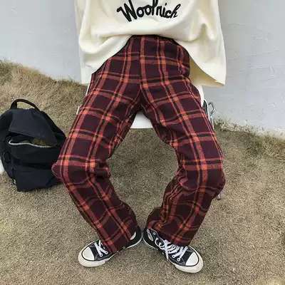 Flower field window Y482 plaid woolen pants children slim Joker new retro high waist loose wide leg straight pants